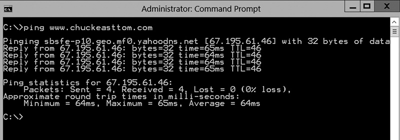 You can see in Figure 1-3 that a 32-byte echo packet was sent to the destination and returned. The TTL item means time to live. That time unit is how many intermediary steps, or hops, the packet should take to the destination before giving up. Remember that the Internet is a vast conglomerate of interconnected networks. Your packet probably won’t go straight to its destination. It will have to take several hops to get there. As with ipconfig, you can type in ping -? to find out various ways you can refine your ping.
