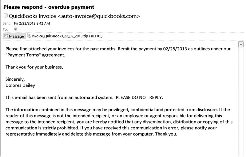 The email entices the user into clicking on the attachment and downloading it. At that point, some sort of malware is installed on the user’s machine.