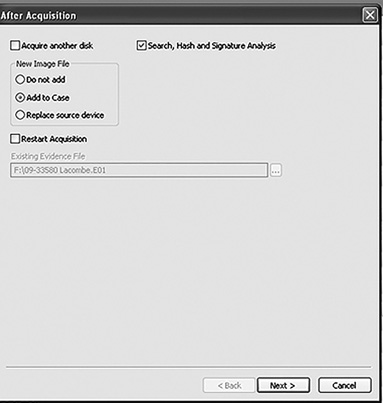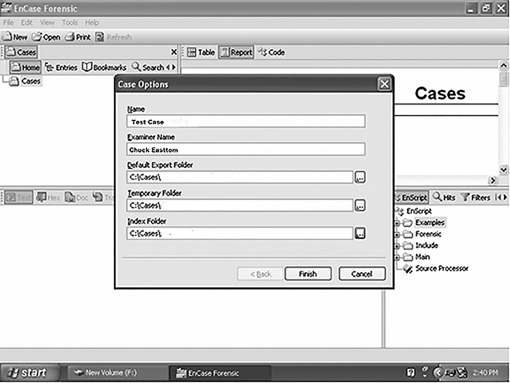 This dialog box allows you to type in the case name and the examiner’s name. Tracking evidence by case and examiner is one convenient feature of EnCase that helps make it popular with law enforcement agencies. The text boxes are filled in automatically, but you have to click on the button on the right side next to each of the lower text boxes to select the paths. After selecting the paths, click the Finish button.