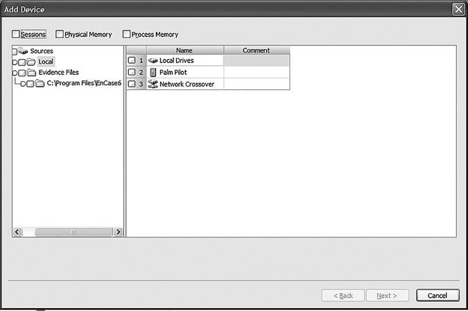 Now that you have created the case, you need to save it by clicking the Save icon on the EnCase toolbar. Select a path for the save location when prompted. Now, you are ready to acquire evidence. On the EnCase toolbar, click the Add Device button. The Add Device window appears in EnCase, asking which device to add, as shown in FIGURE 4-9.