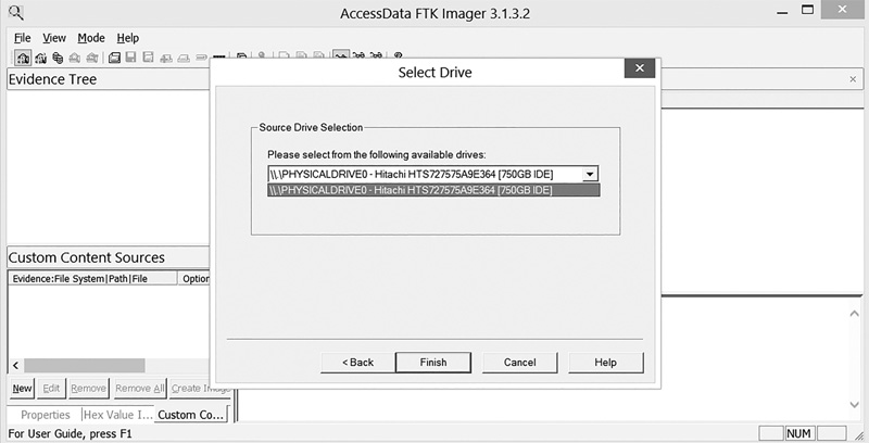 Next, from the Select Drive drop-down, choose the specific drive you want to acquire and then click Finish. FTK mounts the drive; you can then see it in the evidence tree, as shown in FIGURE 4-13.