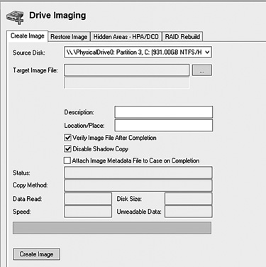 OSForensics allows you to mount images created with other tools, but also allows you to create an image. The first step is to select Drive Imaging from the menu on the left, as shown in FIGURE 4-14. Then you will select the source drive you wish to image, and the target where you want to put the image. Notice that Verify Image is checked by default. (See FIGURE 4-15.) You should not uncheck this.