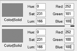 Now consider what happens if you change just one bit. In FIGURE 5-2, you see a color that is defined by three numbers: 252, 101, and 100. You can change the 101 by just one bit and make it 100, as you see in FIGURE 5-3.