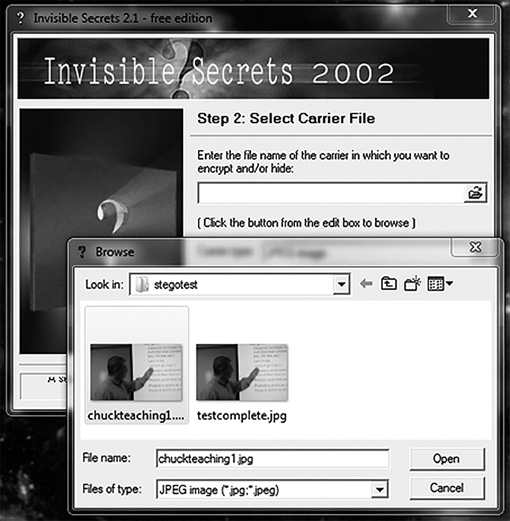 Now select an image you want to use as the carrier file. You can see this in FIGURE 5-5. Select the file you want to hide. It can be a text file or another image file. You can also choose to encrypt as well as hide. This is shown in FIGURE 5-6.