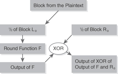 The output of each round function F and the remaining half of the data are then run through the exclusive OR (XOR) function. This means, for example, that you take L0, pass it through the round function F, then take the result and XOR it with R0.