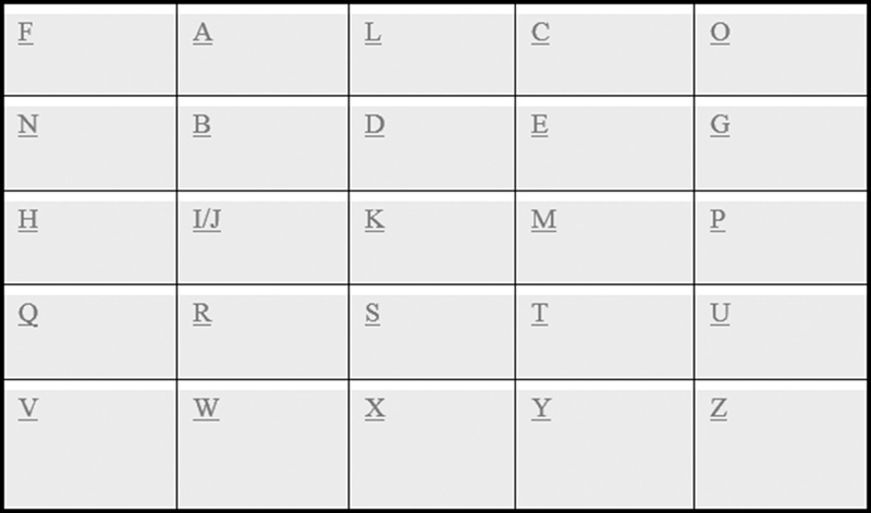 Any square of 5 × 5 letters can be used. You first fill in the keyword, then start, in order, adding in letters that did not appear in the keyword. I/J are combined. You can see this in the table below. In this example, the keyword is “falcon.”