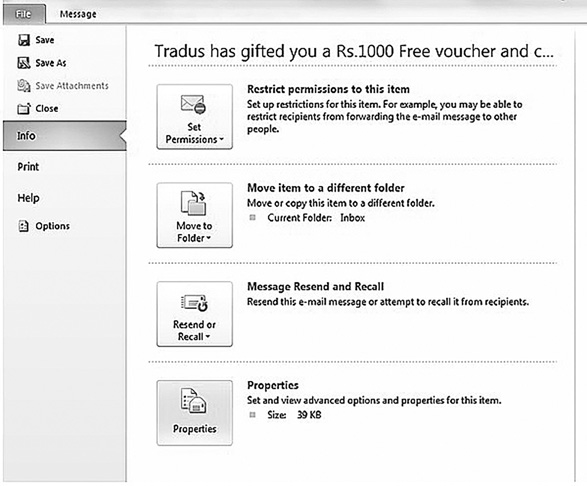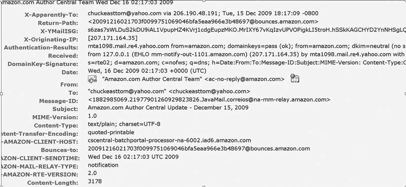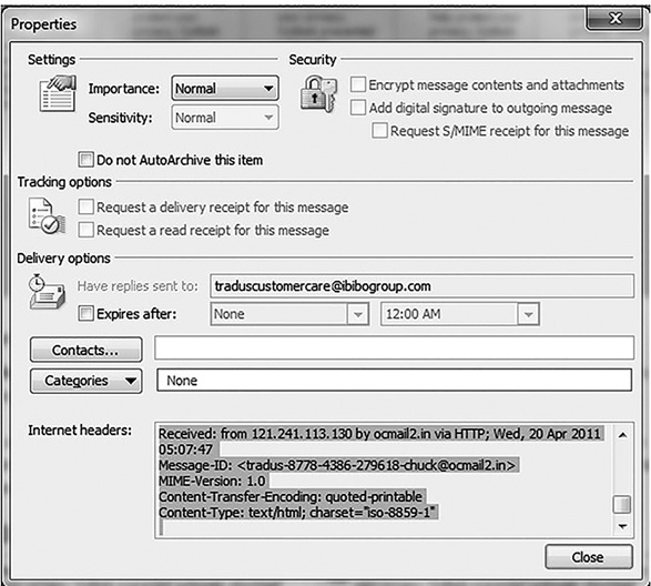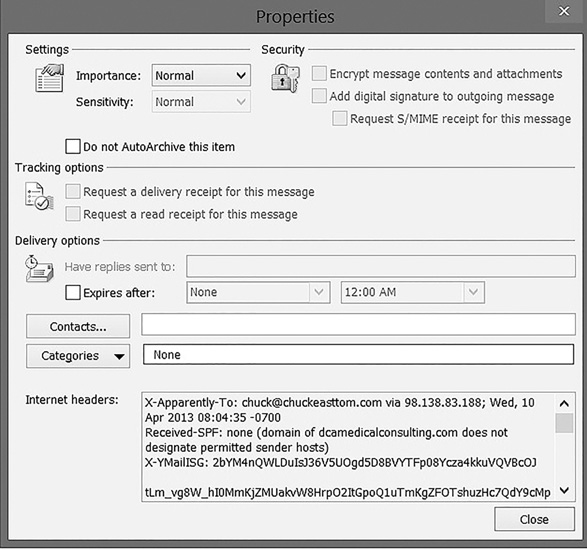 To look at a header in Outlook 2010, with a specific message open, select File and then Info, as shown in FIGURE 7-2. Then select Properties, and you will be able to view the headers, as shown in FIGURE 7-3.