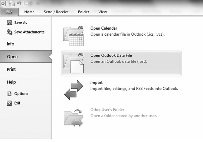 You need to know how to find these files and how to view them. For example, in Outlook a clever criminal might have a second .pst file containing email messages that he loads only when committing his nefarious activities. If his computer is seized and you simply look in Microsoft Outlook, you won’t see any incriminating evidence. If you search the suspect drive and find an additional .pst file, you can easily mount it in Outlook by selecting File, Open, and Open Outlook Data File, as shown in FIGURE 7-9.