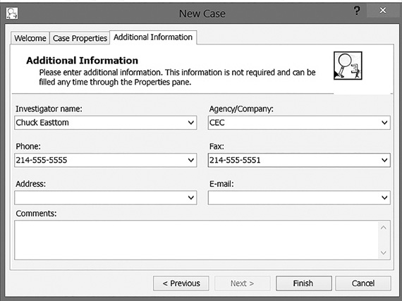 Although there are many tools available that may be used with email forensics, Paraben’s Email Examiner is exclusively for email forensics, so it merits a closer look. Paraben works like the more complete forensic suites (Forensic Toolkit and EnCase) in that evidence is grouped by case. When you first start Paraben, you select New and then create a new case, as shown in FIGURE 7-10. Paraben will also associate information about the investigator along with the case information. This is shown in FIGURE 7-11.