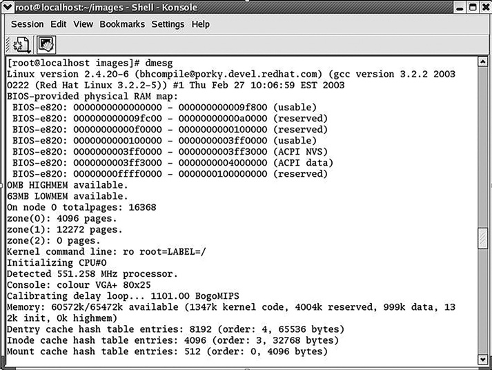 The command dmesg displays the messages for you; however, it does tend to fill up multiple screens. It is recommended that you simply pipe the output to some file (for example, dmesg>myfile.txt) and then search that file. You can see some sample output of dmesg in FIGURE 9-5.