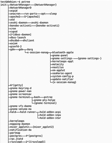 pstree CommandThe pstree command is very similar to the ps command, except it shows all the processes in the form of a tree structure. The tree format gives more information particular to a given forensic investigation. Not only will you know which processes are running, but also which process initiated those processes. You can see an example of pstree in FIGURE 9-6.