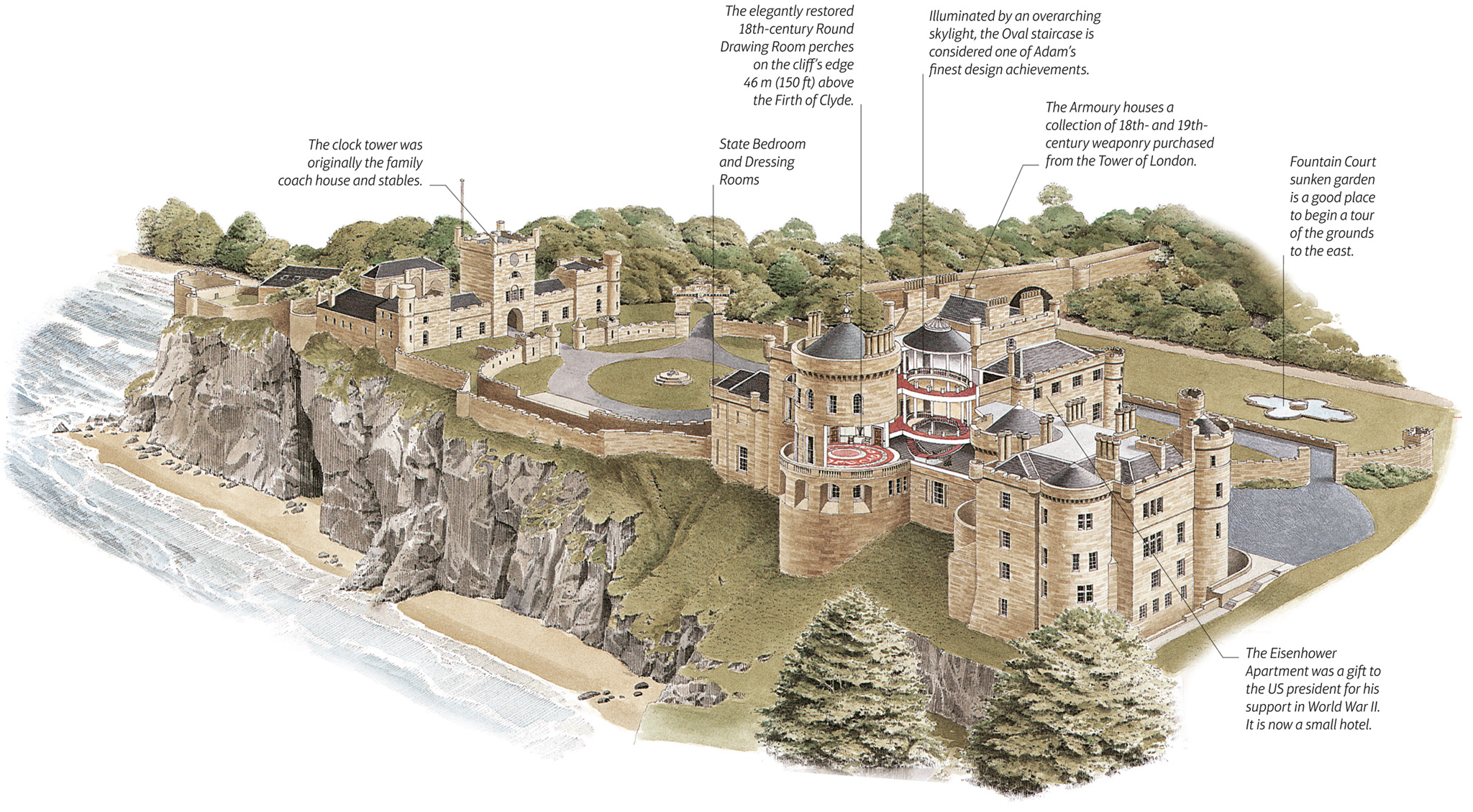 t Illustration of Culzean Castle perched on its magnificent clifftop setting