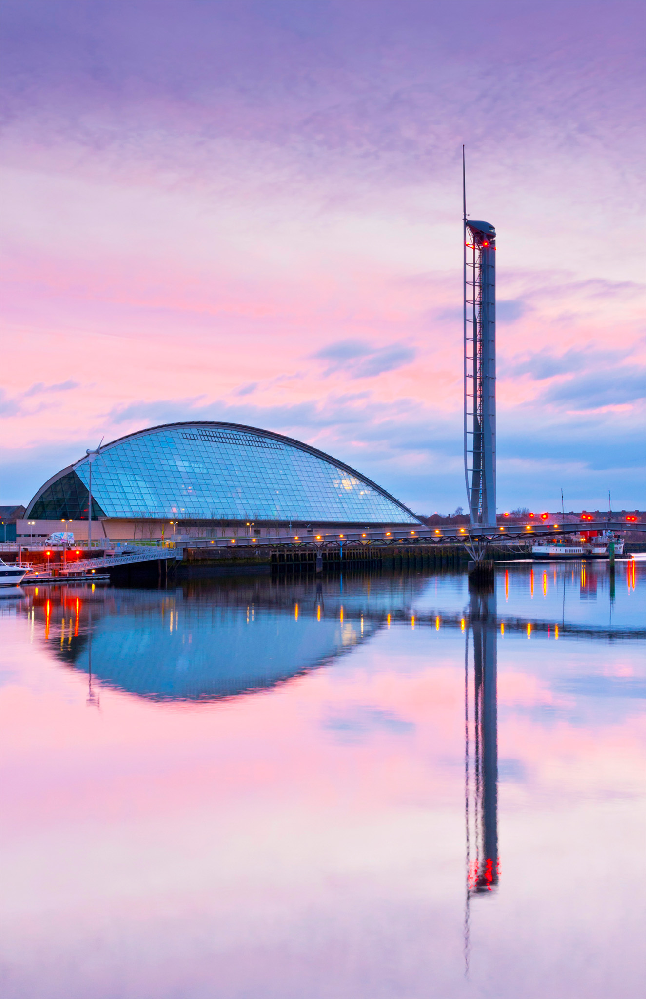 t Futuristic structures of Glasgow Science Centre reflected in the River Clyde