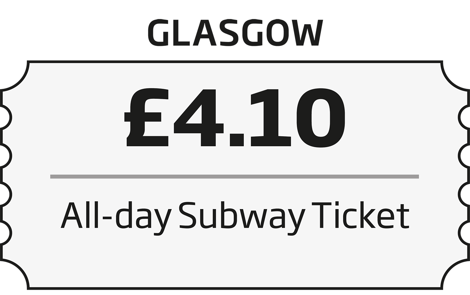 Glasgow’s SPT subway, the only underground rail service in Scotland, comprises a 7 mile (10 km) loop connecting 15 stations around the city centre. Trains run every 4 minutes at peak times, and it takes 24 minutes to ride a complete loop. Tickets can be bought at any subway station. Single tickets are a fixed price and are valid on any journey. Savings can be made by purchasing a return (£3.20) or an all-day pass (£4.10).