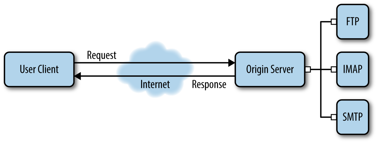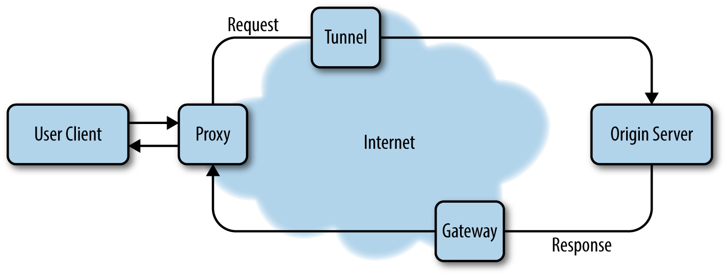 Recall that the REST architectural style advocates for independent deployment, scalability of components and interactions, and generality of interfaces. The message flow between client and server is also completely dynamic. This has two major implications. The first, and most obvious, is that the path followed by the request message can be different from the path followed by the response message (Figure 1-2). The second implication is that it is not necessary for each component to be aware of the whole network topology to route messages.
