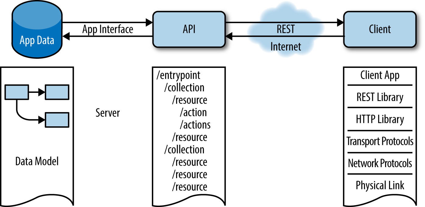 APIs are not exactly a novelty, or something that has been developed only in the web world. In fact, an API simply specifies a set of functions that can be used to interact with some components. These actions and components can be a database system that needs to be accessed by a web server, or a video card exposing some of its functionality through a software library. In REST architectures, APIs define actions that access or modify resources through the exchanged representations (Figure 3-1).