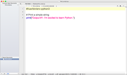 While writing your Python code in a text editor such as Notepad or TextEdit is completely acceptable and effective, there are other free text editors you can download that offer additional features, including code highlighting, adjustable tab sizes, and multi-line indenting and dedenting. These features (particularly code highlighting and multi-line indenting and dedenting) are incredibly helpful, especially while you’re learning to write and debug your code.