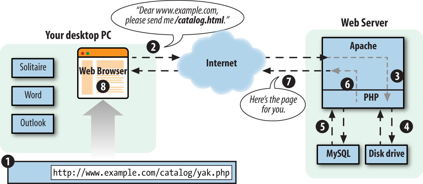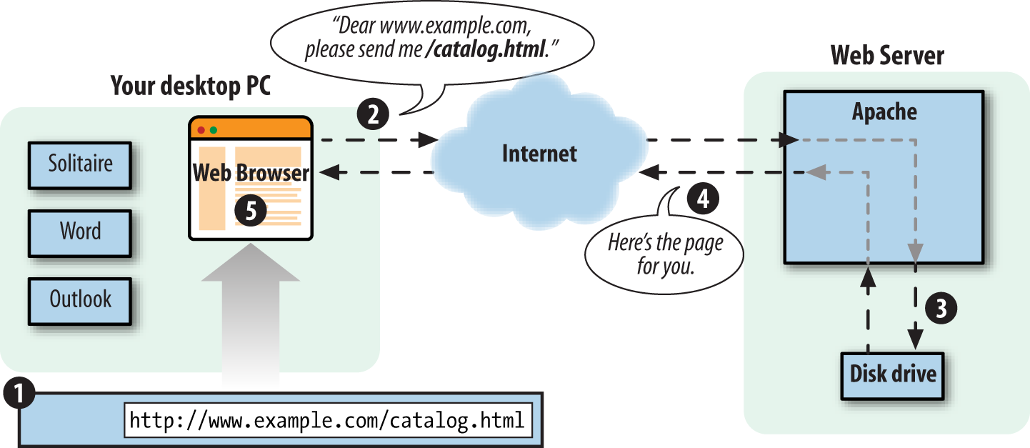 When you sit down at your computer and pull up a web page using a browser such as Safari or Firefox, you cause a little conversation to happen over the Internet between your computer and another computer. This conversation, and how it makes a web page appear on your screen, is illustrated in Figure 1-1.