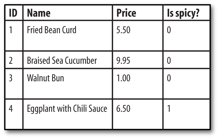 try{// Connect$db=newPDO('sqlite:/tmp/restaurant.db');// Set up exceptions on DB errors$db->setAttribute(PDO::ATTR_ERRMODE,PDO::ERRMODE_EXCEPTION);$stmt=$db->query('SELECT * FROM dishes ORDER BY price');$dishes=$stmt->fetchAll();if(count($dishes)==0){$html='<p>No dishes to display</p>';}else{$html="<table>\n";$html.="<tr><th>Dish Name</th><th>Price</th><th>Spicy?</th></tr>\n";foreach($dishesas$dish){$html.='<tr><td>'.htmlentities($dish['dish_name']).'</td><td>$'.sprintf('%.02f',$dish['price']).'</td><td>'.($dish['is_spicy']?'Yes':'No')."</td></tr>\n";}$html.="</table>";}}catch(PDOException$e){$html="Can't show dishes: ".$e->getMessage();}$html;