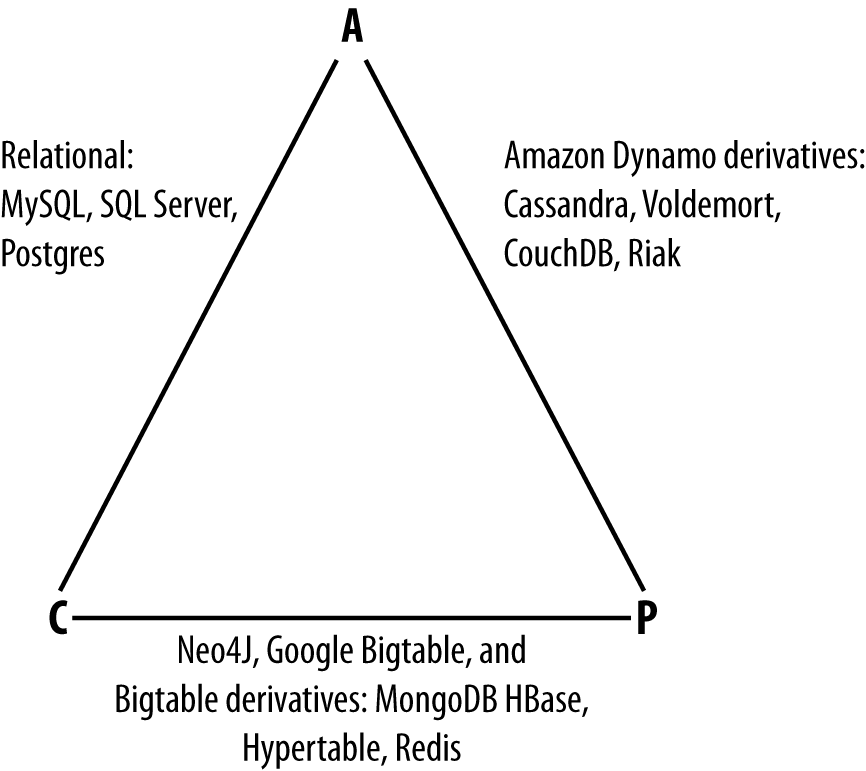 Graph databases such as Neo4J and the set of databases derived at least in part from the design of Google’s Bigtable database (such as MongoDB, HBase, Hypertable, and Redis) all are focused slightly less on availability and more on ensuring consistency and partition tolerance.