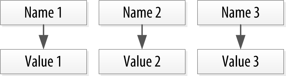So we’d like to add a second dimension to this list: names to match the values. We’ll give names to each cell, and now we have a map structure, as shown in Figure 4-2.