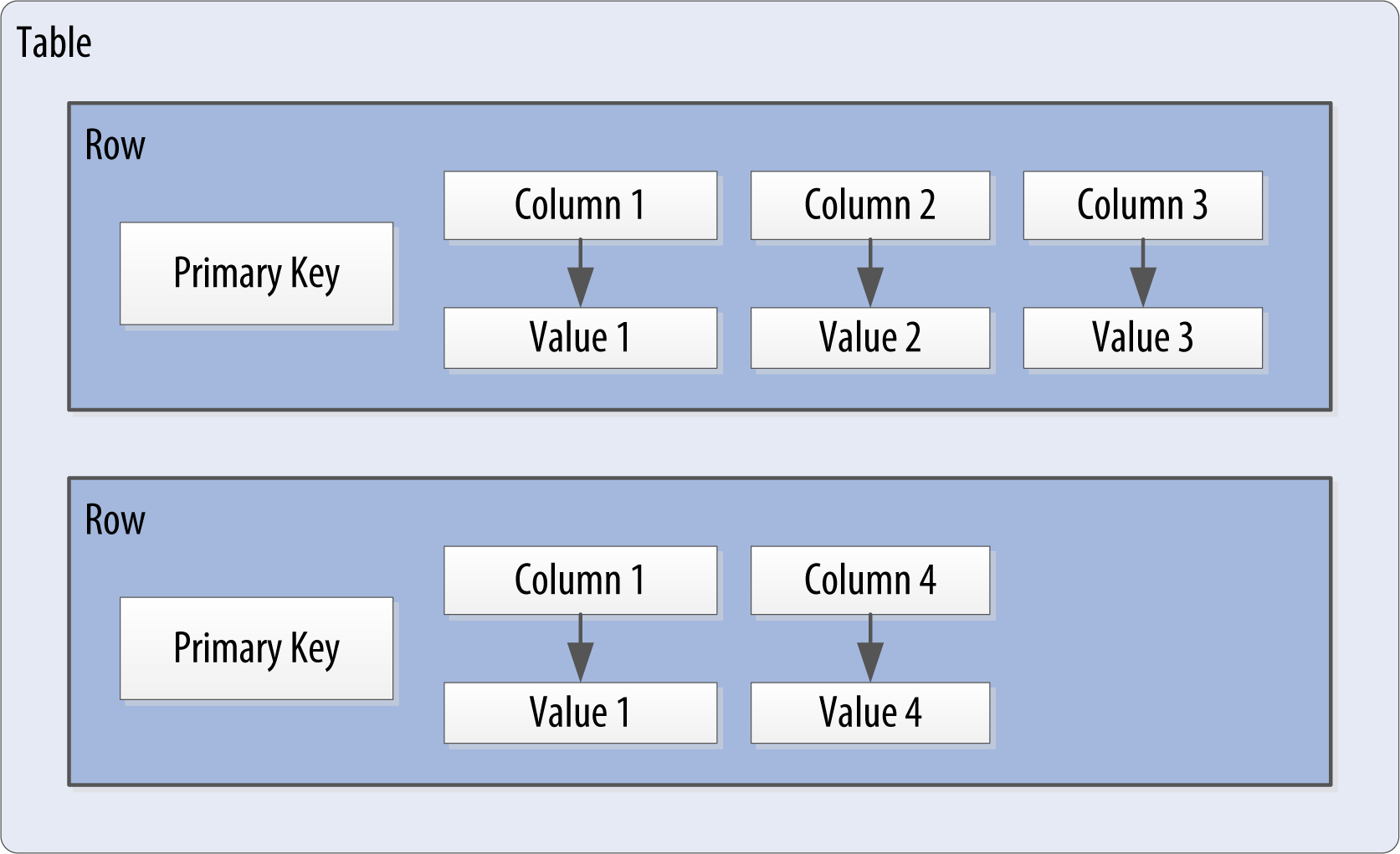 A wide row means a row that has lots and lots (perhaps tens of thousands or even millions) of columns. Typically there is a smaller number of rows that go along with so many columns. Conversely, you could have something closer to a relational model, where you define a smaller number of columns and use many different rows—that’s the skinny model. We’ve already seen a skinny model in Figure 4-4.
