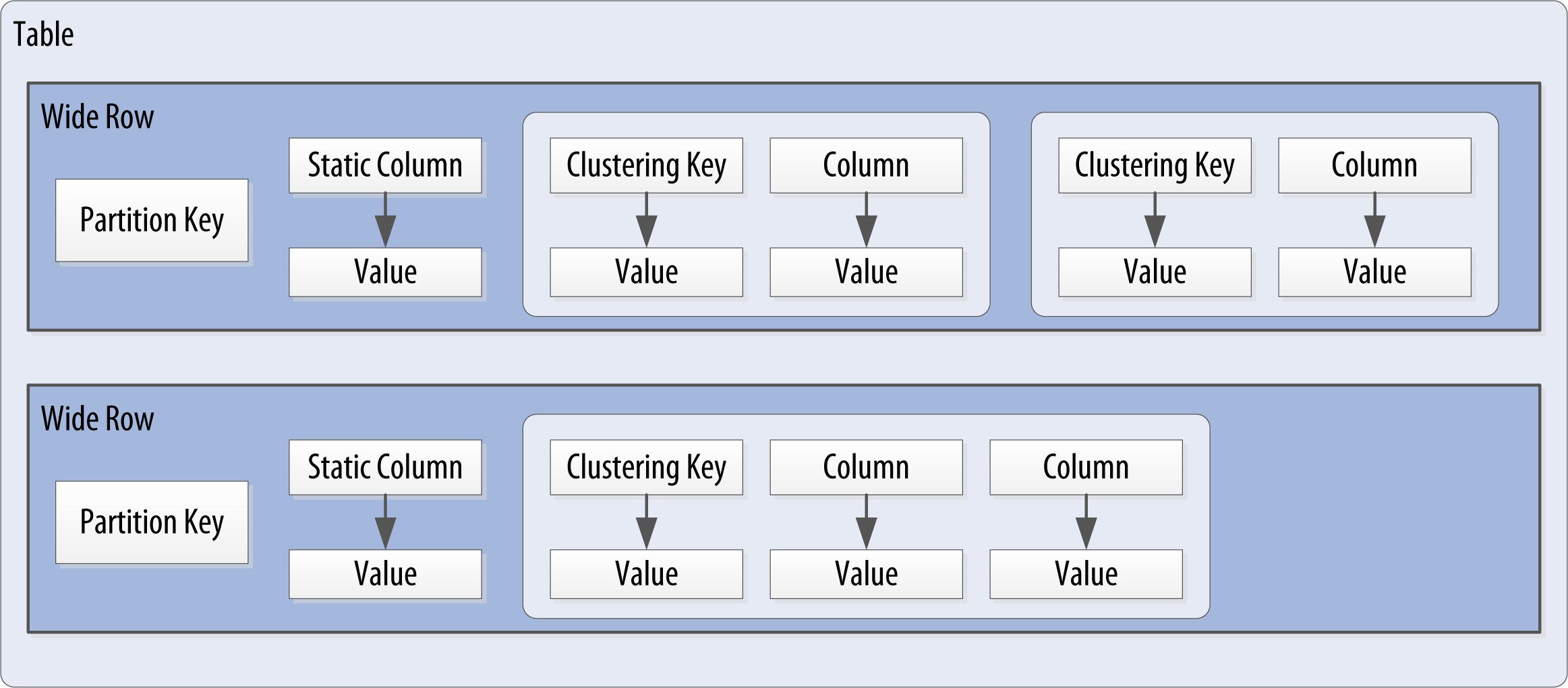 Figure 4-5 shows how each partition is uniquely identified by a partition key, and how the clustering keys are used to uniquely identify the rows within a partition.