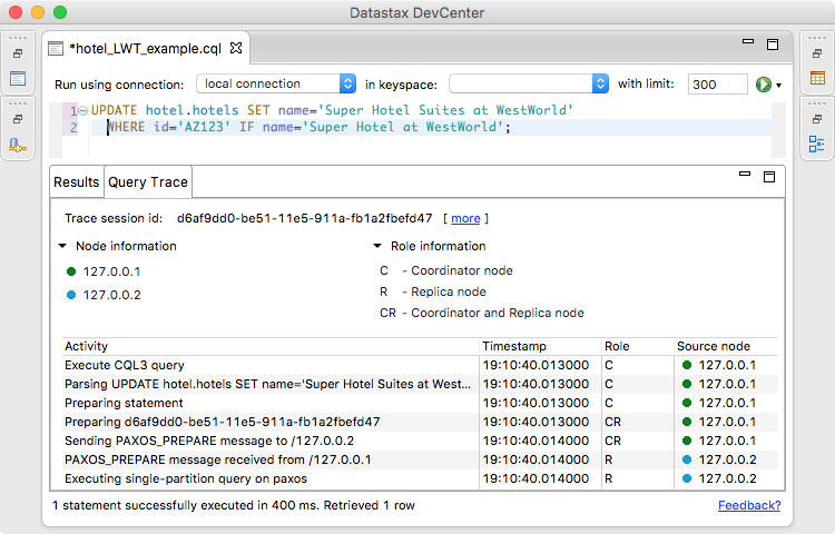 cqlsh:hotel> TRACING ON Now Tracing is enabled cqlsh:hotel> SELECT * from hotels where id='AZ123'; id | address | name | phone | pois -------+---------+---------------------------------+----------------+------ AZ123 | null | Super Hotel Suites at WestWorld | 1-888-999-9999 | null (1 rows) Tracing session: 6669f210-de99-11e5-bdb9-59bbf54c4f73 activity | timestamp | source | source_elapsed --------------------+----------------------------+-----------+---------------- Execute CQL3 query | 2016-02-28 21:03:33.503000 | 127.0.0.1 | 0 Parsing SELECT *... | 2016-02-28 21:03:33.505000 | 127.0.0.1 | 41491 ...