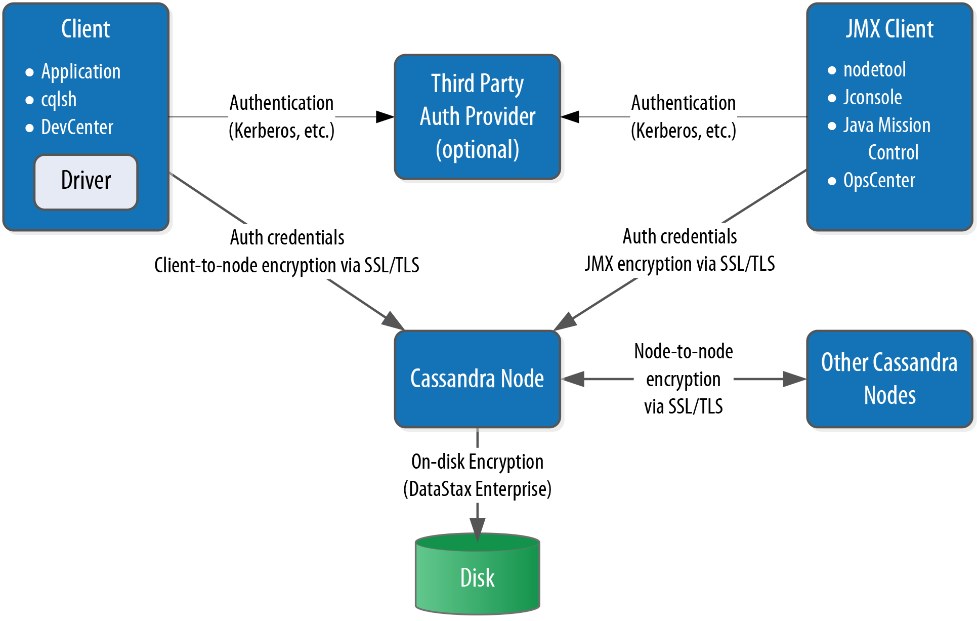 Cassandra’s security features include authentication, role-based authorization, and encryption, as shown in Figure 13-1.