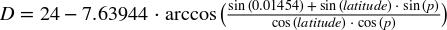 The variable D holds the number of hours of daylight, so multiply that by 60 for your final result. If you feel that these formulas are a bit too complicated to type as single expressions (I certainly did!), break them down by using let for the parts.
