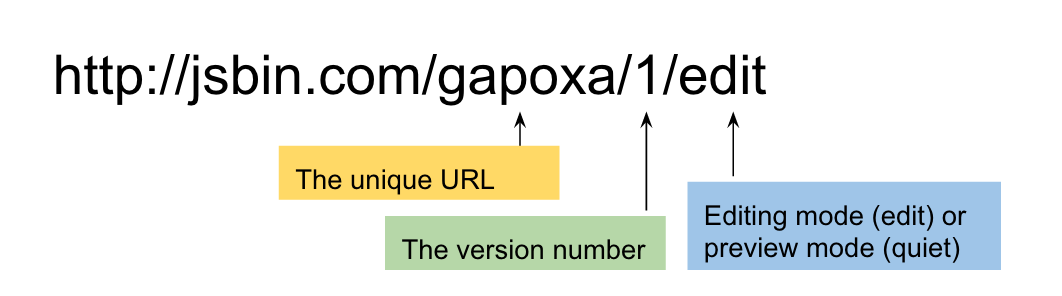 The letters that follow jsbin.com represent the unique URL key. After the next slash is the version number. In the last part of the URL, there will be one of two words: edit for editing mode or quiet for preview mode.