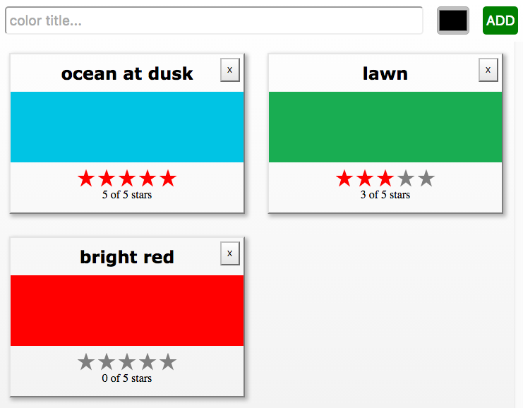 PUT '/color/:id'Changes the rating of a color. The color’s ID is obtained from route paramaters and used in the new action object.