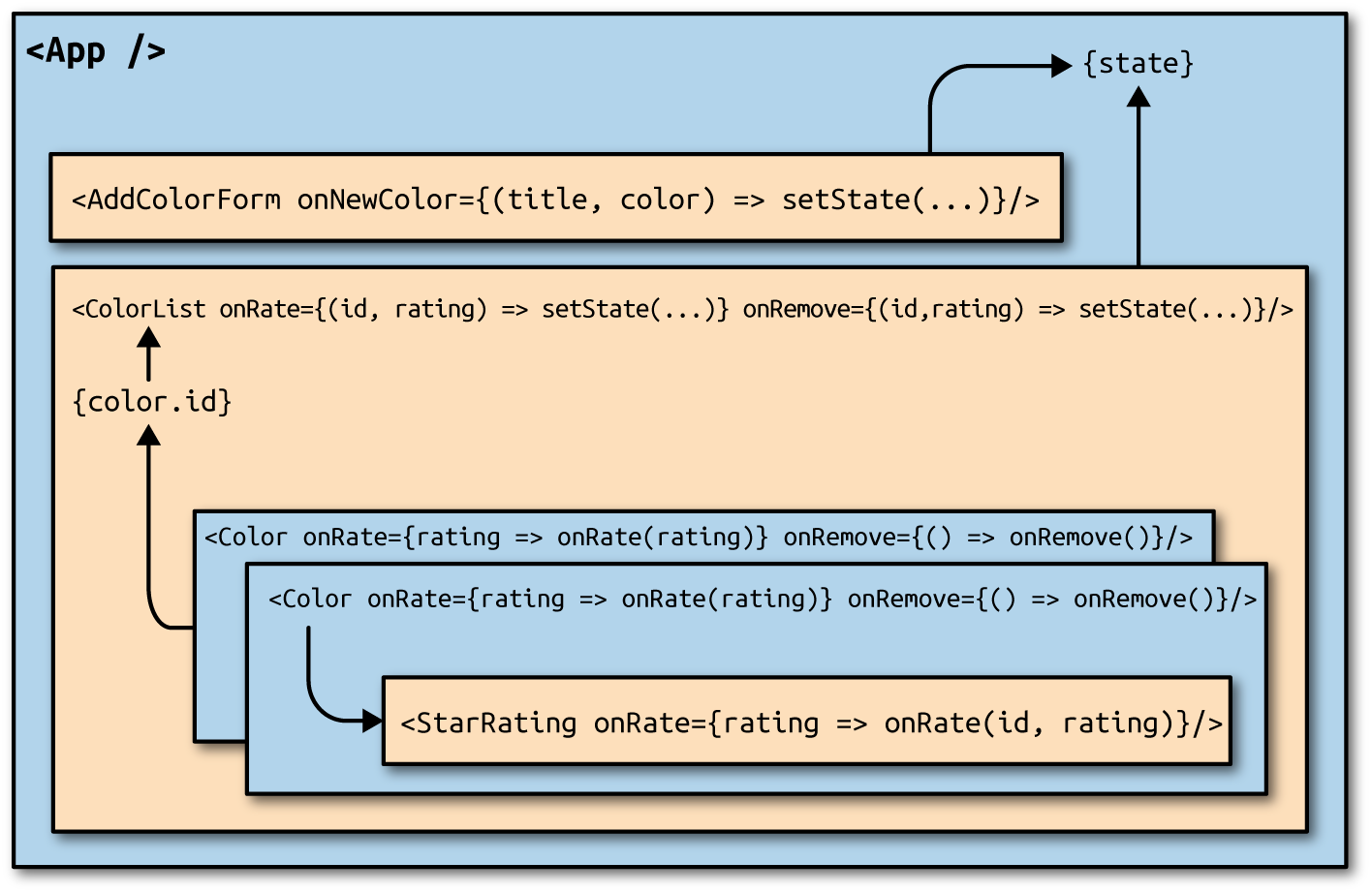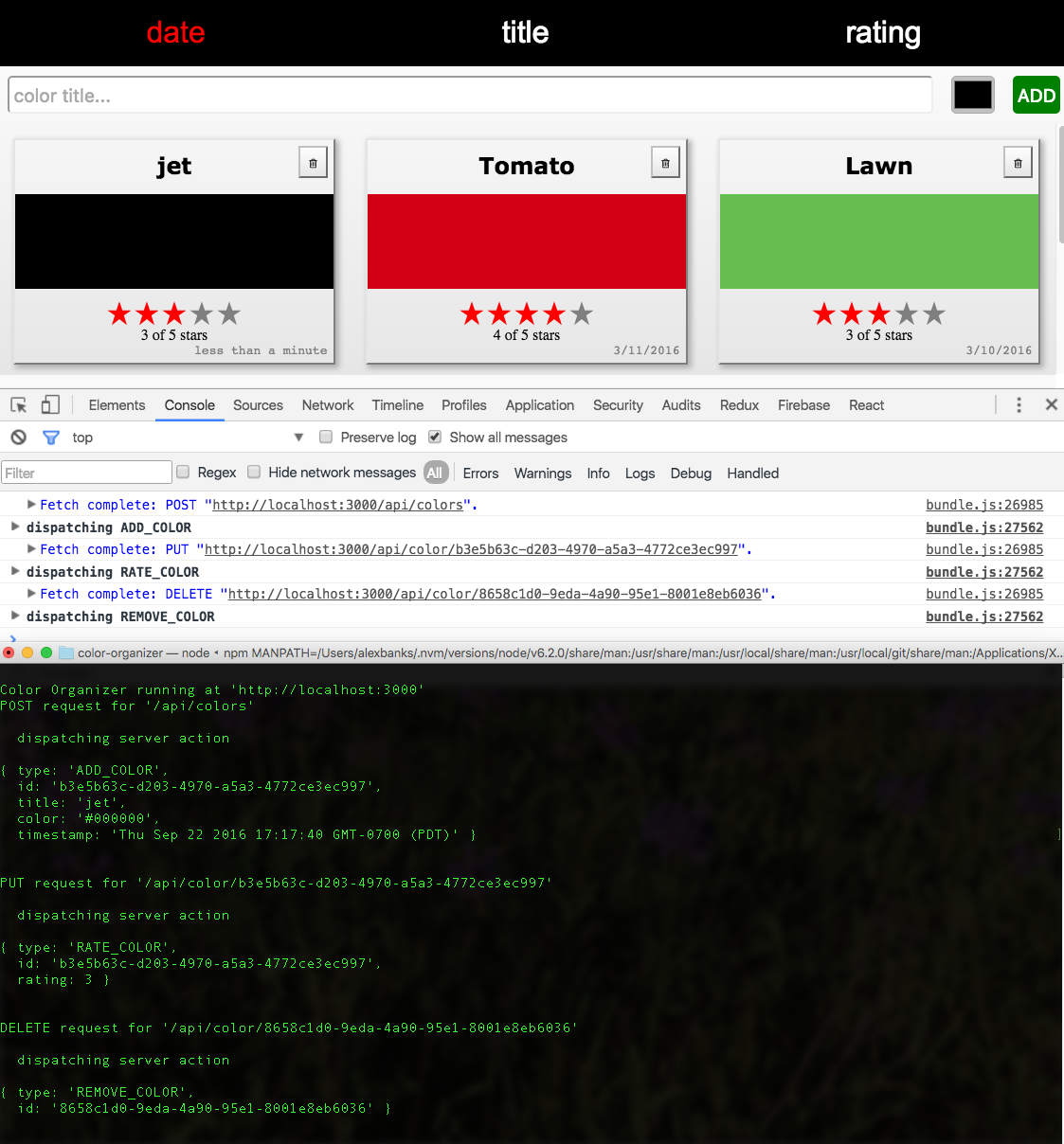 At present, the color organizer is rendering UI on the server and re-rendering UI in the browser. Once the browser takes over, the organizer functions as a single-page application. Users dispatch actions locally, the local state changes, and locally the UI is updated. Everything is working well in the browser, but the dispatched actions are not making it back to the server.