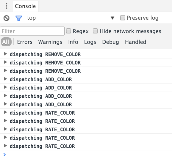 exportconstrateColor=id=>(dispatch,getState)=>{dispatch({type:"RANDOM_RATING_STARTED"})setInterval(()=>dispatch({type:"RATE_COLOR",id,rating:Math.floor(Math.random()*5)}),1000)}...store.dispatch(rateColor("f9005b4e-975e-433d-a646-79df172e1dbb"))