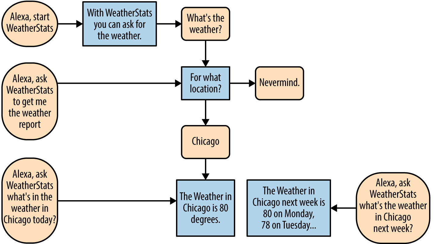 “Alexa, what’s the weather?” This verbal command responds with the weather report, then the conversation is over. This is great for a single command but if you want a greater conversational experience, then you will need to map out your conversational model carefully. We will dive deeper into conversational models throughout this book, but for now keep in mind that conversational models (sometimes referred to as conversational UI) help elevate the user experience by providing a deeper level of conversation versus single voice commands. For instance, something as simple as following up the weather response with a “thank you,” then having your conversational interface respond with “you’re welcome,” goes a long way in elevating the user experience.