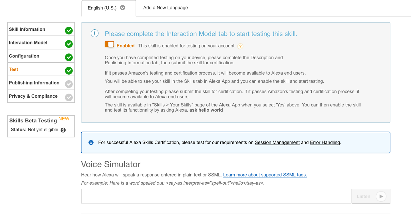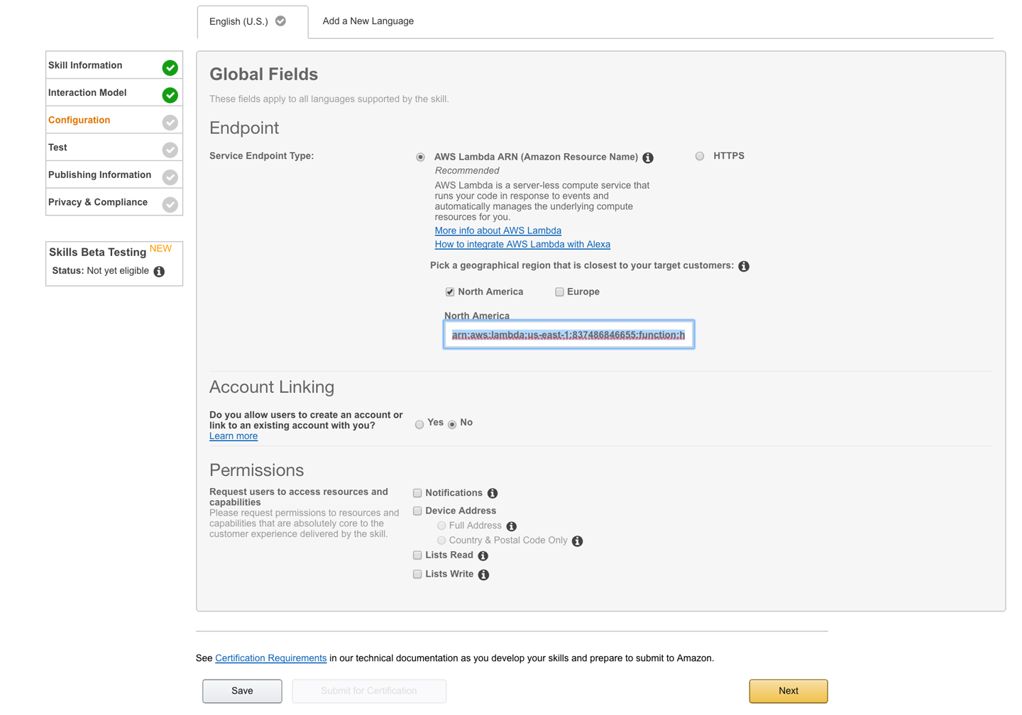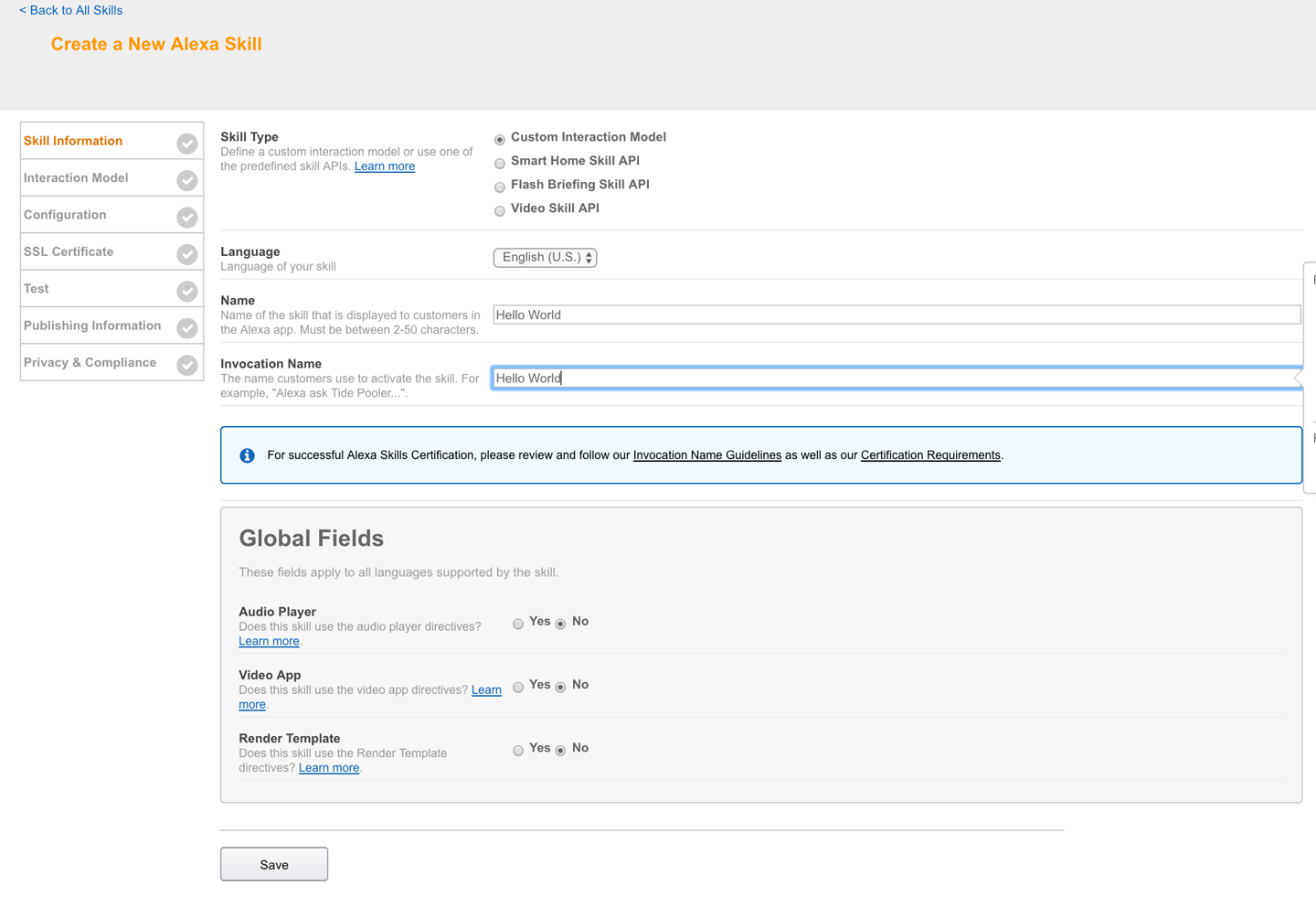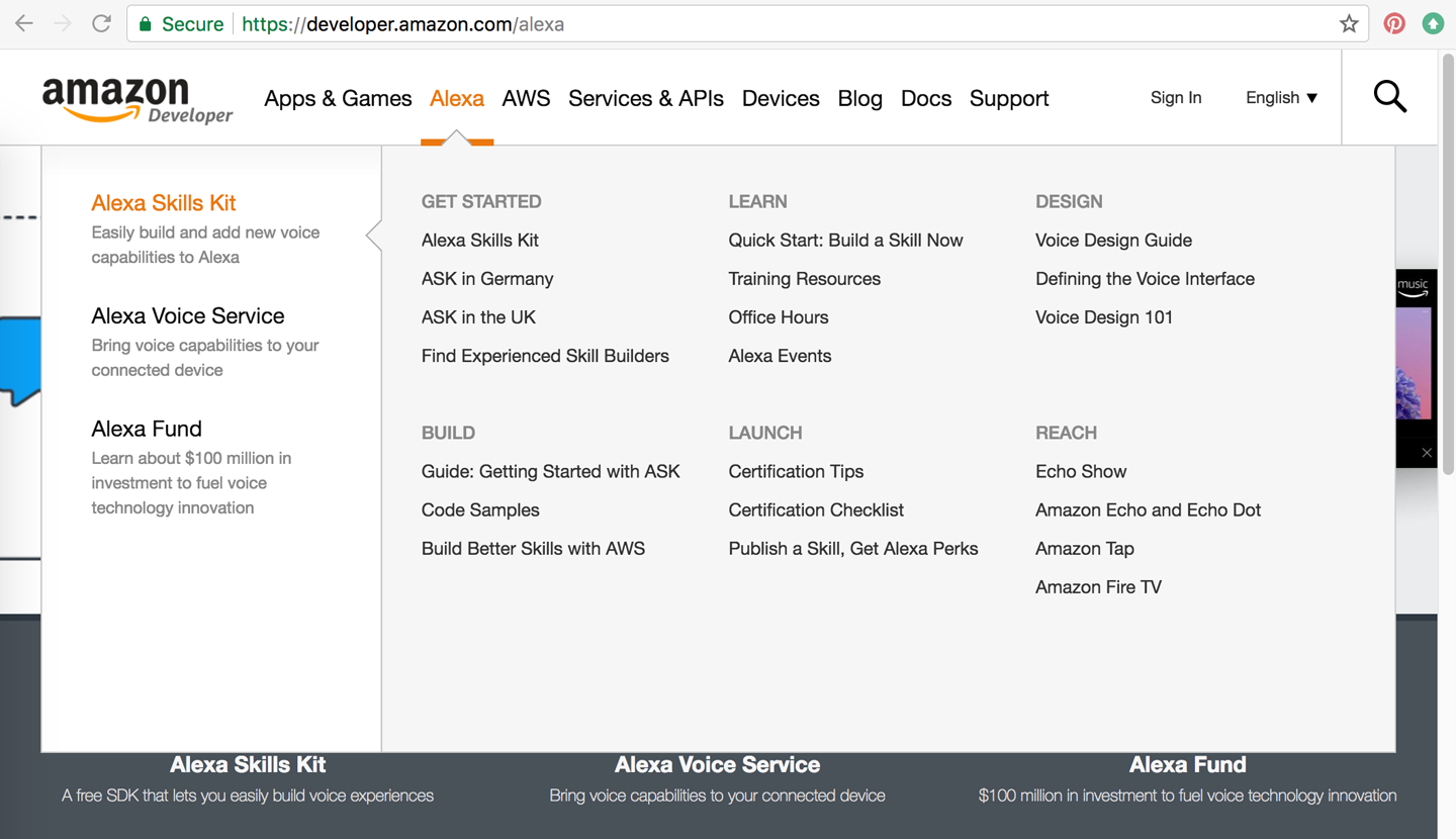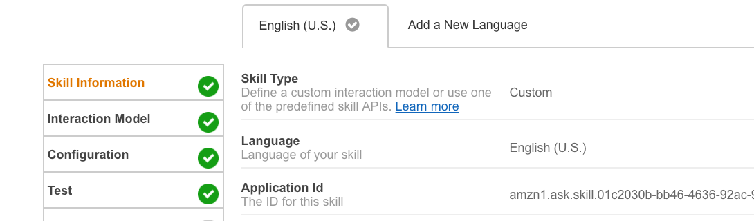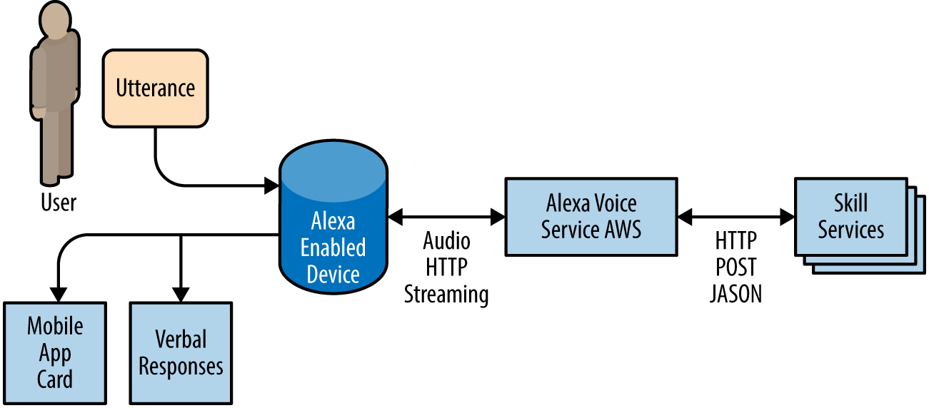 Skills are somewhat similar to apps—in other words, with Amazon Alexa, you don’t necessarily create apps in the traditional graphical sense; instead you create skills that add functionality to the Alexa ecosystem. There are a number of built-in skills like weather, music, and so on. Currently, the Alexa Skills Kit (ASK), the SDK of sorts for Amazon Alexa, includes various types of skills, including Custom Interaction Model, Smart Home Skill, Flash Briefing Skill, and List Skill.