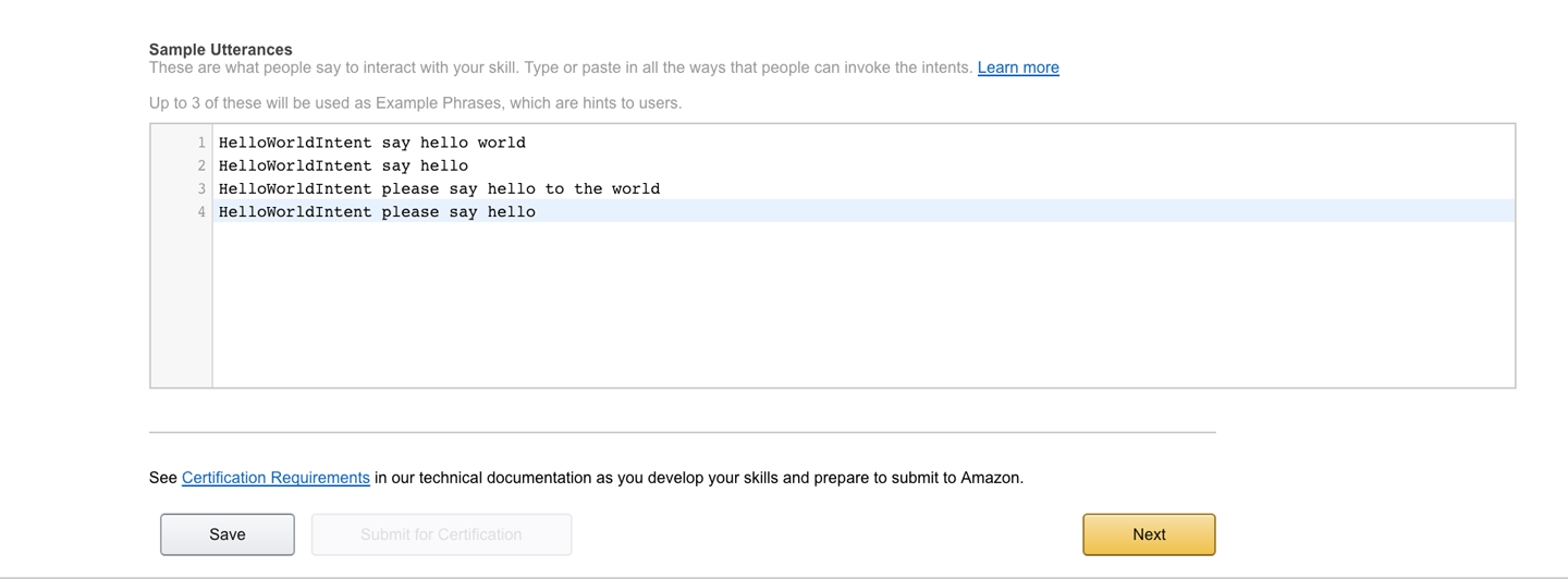 An utterance is a spoken word or phrase. In some services you will see many references to the word “utterances”—for instance, in Amazon’s ASK, you are required to include some “sample utterances” in plain-text form, prefixed with their related intent, as in Example 1-1.