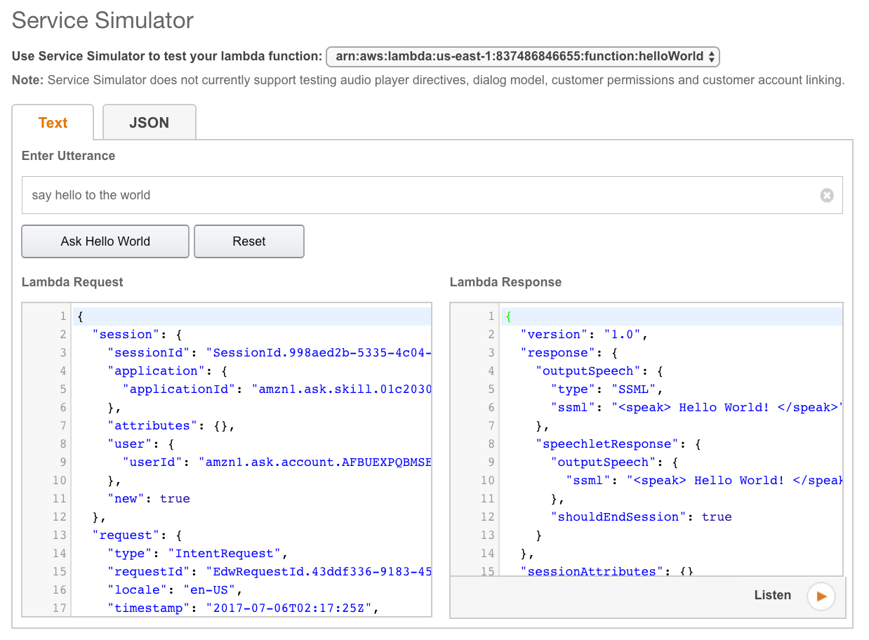 As you can see in this example, the phrase “Hello world” has been requested to be synthesized. The response would include an HTTP stream of the audible “Hello world” phrase. Since no additional parameters were set, the defaults for encoding, language, voice, and other variables will be used to synthesize the speech—for example, MP3 encoding in US English and so on. With this in mind, you can get up and running quickly with the default settings, then evolve the voice output by adjusting the settings as you continue to develop your voice interface.
