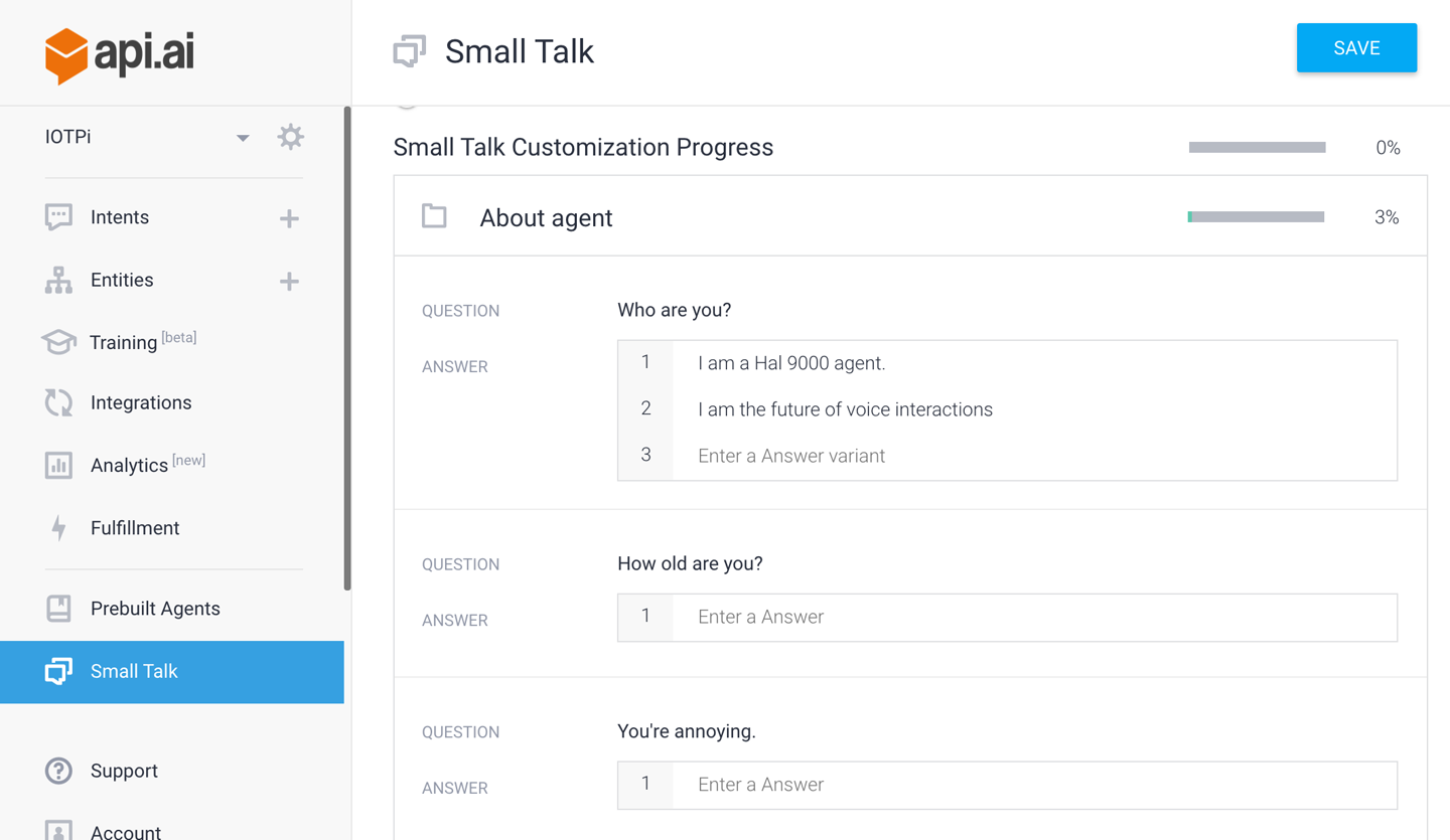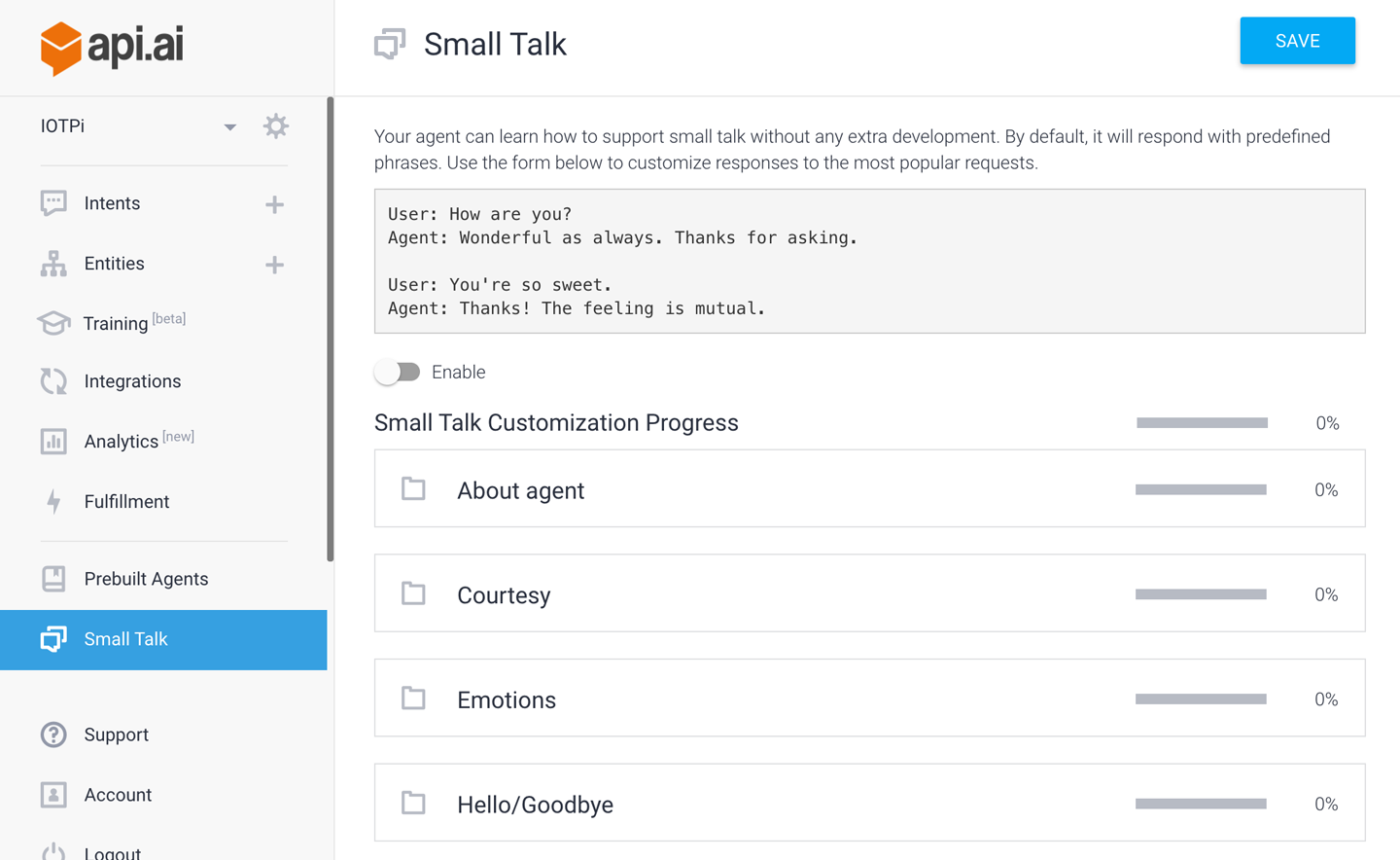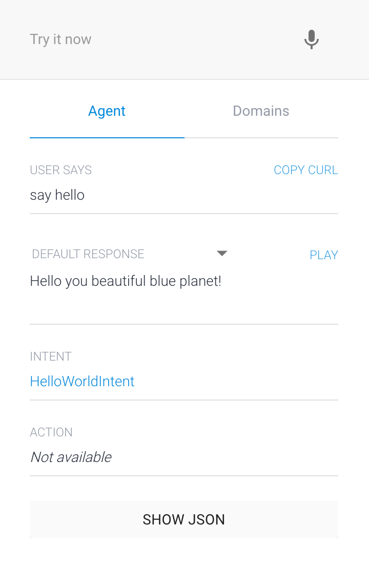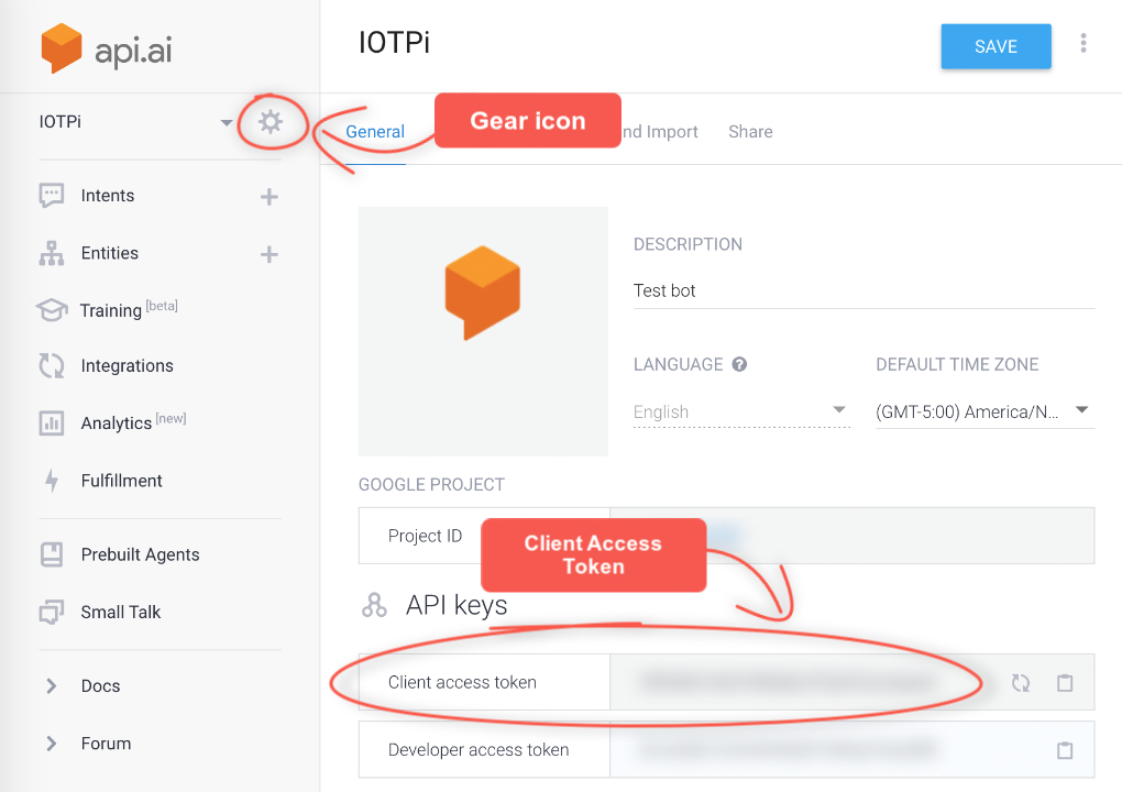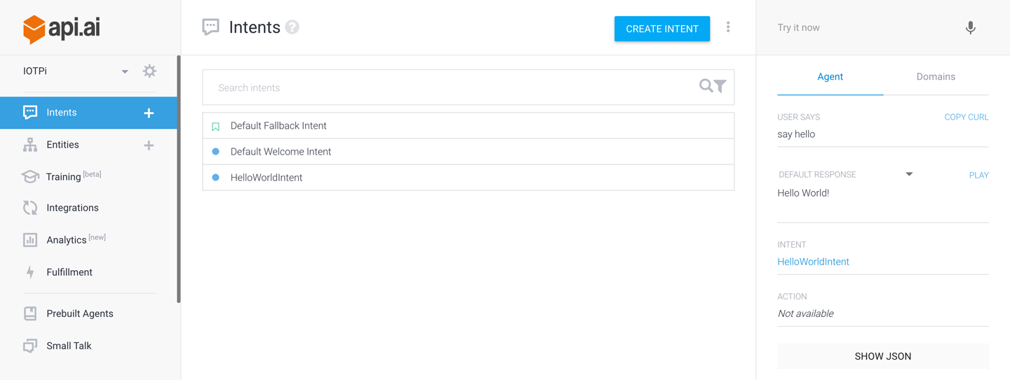 If you choose to copy and paste our code into your project, remember to replace the Client Access Token (APIKEY) to match your API.AI Token. If you choose to simply run our cloned project, you will need to update the Client Access Token as well the Remote Machine IP Address.