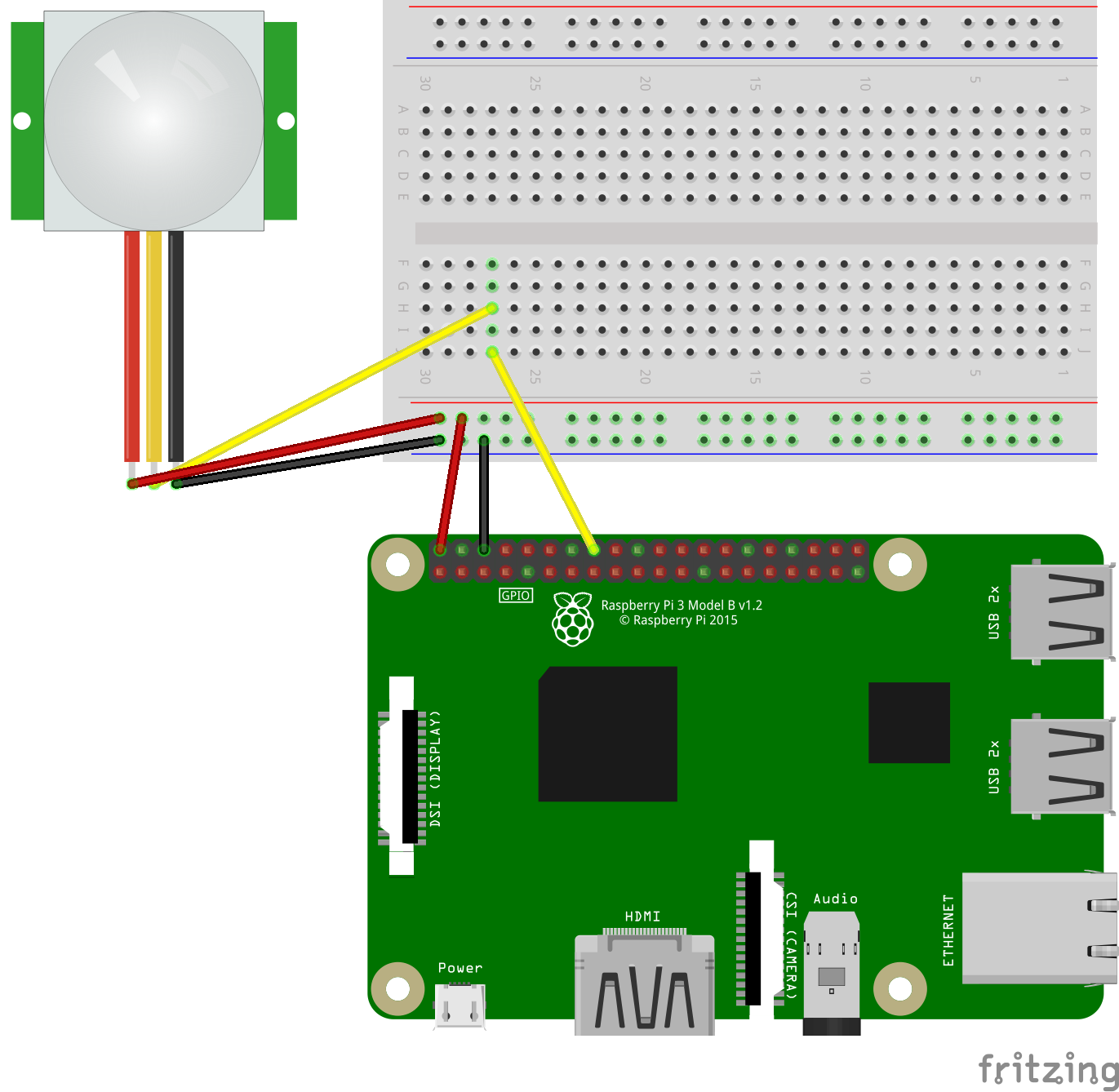 As we mentioned earlier, this example will use a PIR sensor, so let’s get to it. First thing we’ll want to do is take a look at the diagram in Figure 6-2, so we know how to wire up our motion sensor.