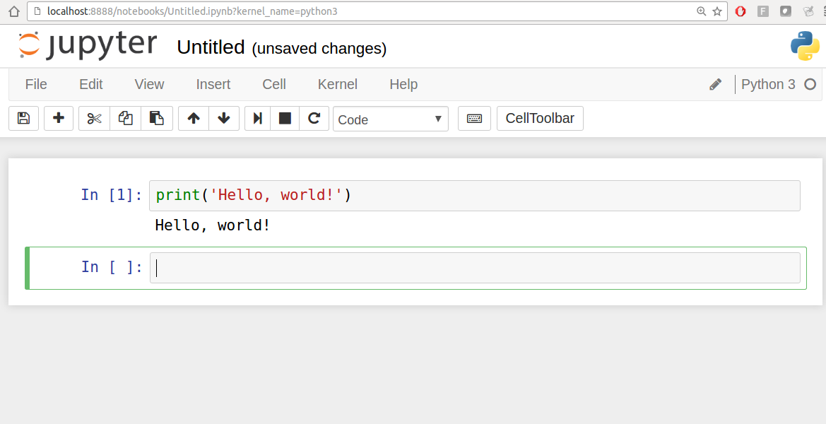 To create a new notebook, click the New button and select the “Python 3” or “conda [default]” option. You should see something like Figure 2-2. If this is your first time, try clicking on the empty code “cell” and entering a line of Python code. Then press Shift-Enter to execute it.