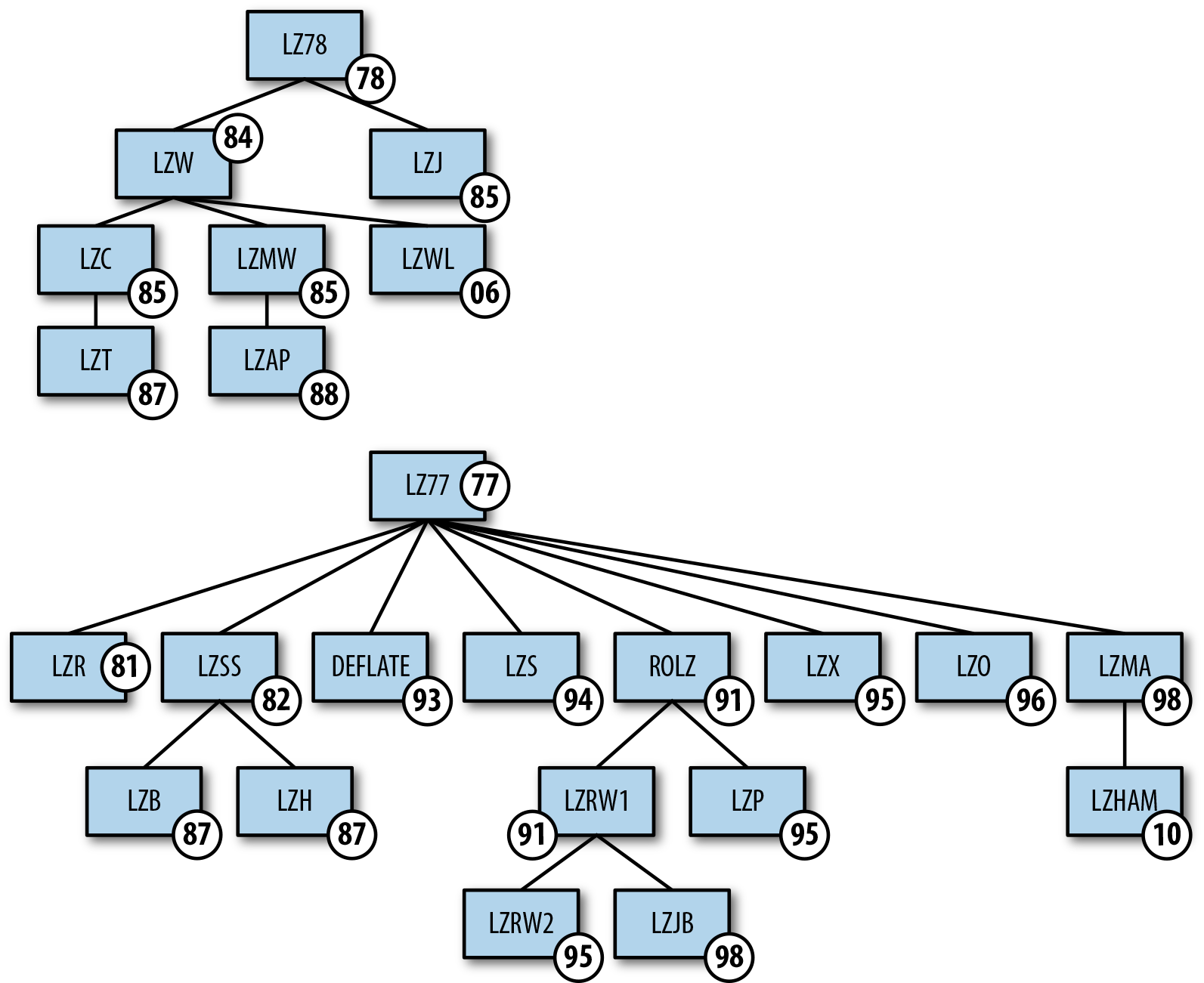 Data compression algorithms are a really, really big space. Fortunately, these algorithms fall into a few buckets, which makes things a lot easier to understand. To throw the words at you, they are variable-length codes, statistical compression, dictionary encodings, context modeling, and multicontext modeling. Each of these five high-level buckets contains a horde of algorithm variations, which is a good thing; each variation differs slightly in intended input data, performance, memory constraints, and output sizes. Picking the correct variant means carrying out tests on your data and the encoders to find the one that works best.