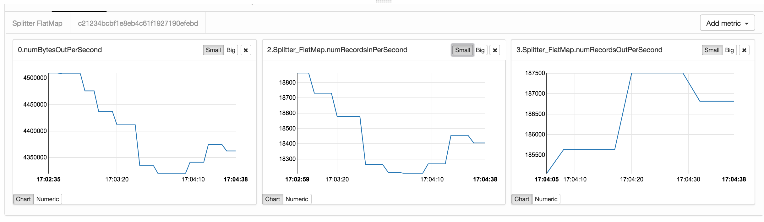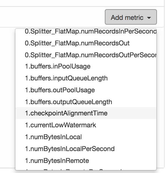 If you click on the Task Metrics tab, you can select more metrics from a drop-down menu, as shown in Figure Figure 10-3. These include more fine-grained statistics about your tasks, such as buffer usage, watermarks, and input/output rates.