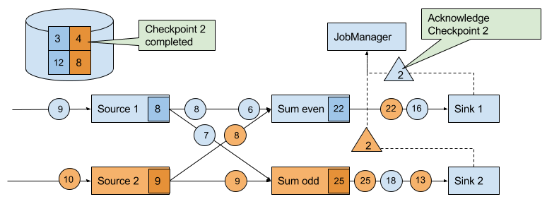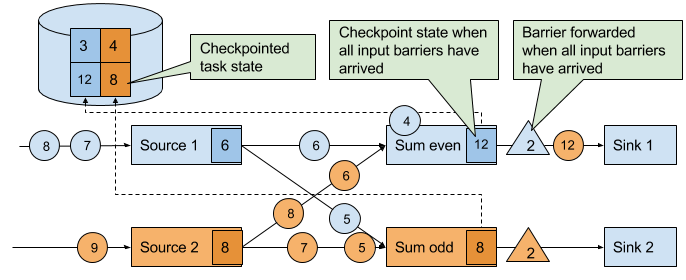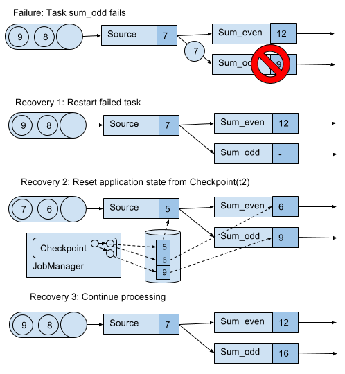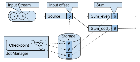 Connecting a stateful streaming application running on Flink and an event log is interesting for multiple reasons. In this architecture the event log acts as a source of truth because it persists the input events and can replay them in an deterministic order. In case of a failure, Flink restores a stateful streaming application by recovering its state from a previously taken checkpoint and resets the read position on the event log.The application will replay (and fast forward) the input events from the event log until it reaches the tail of the stream. This technique is used to recover from failures but can also be leveraged to update an application, fix bugs and repair previously emitted results, migrate an application to a different cluster, or perform A/B tests with different application versions.