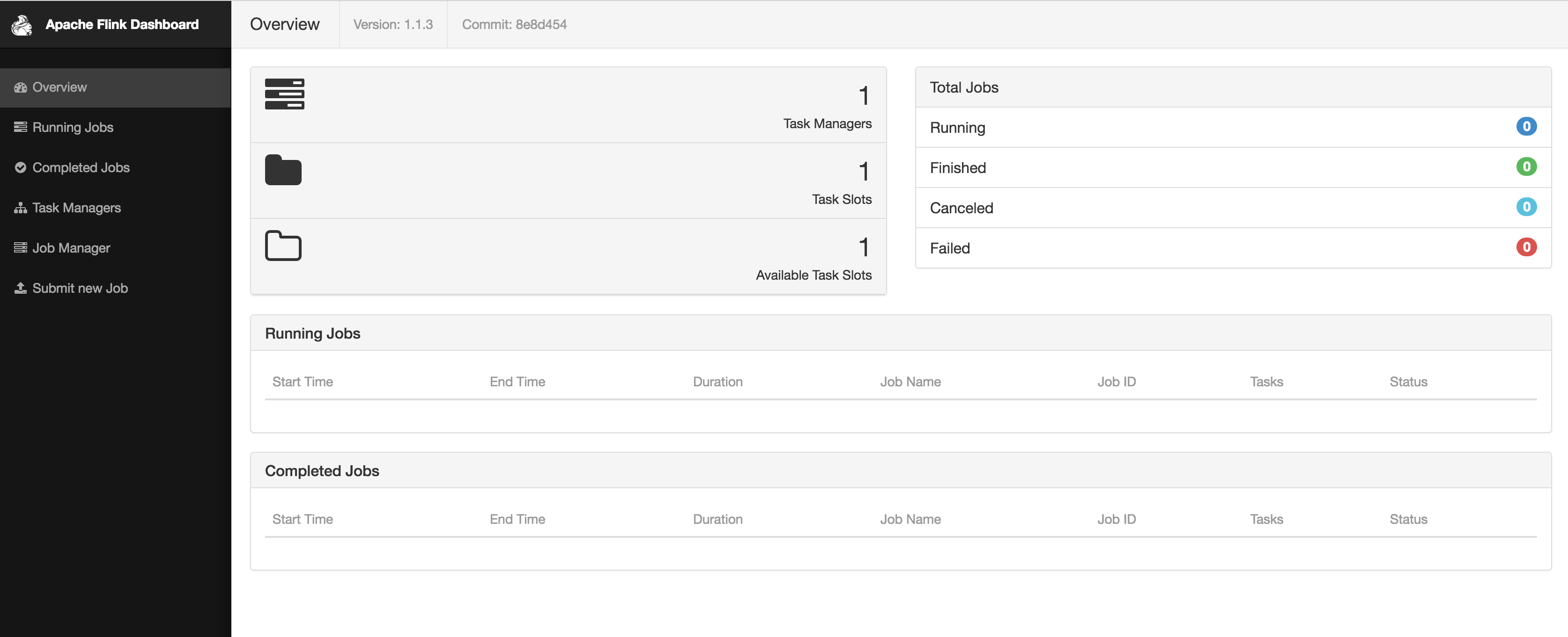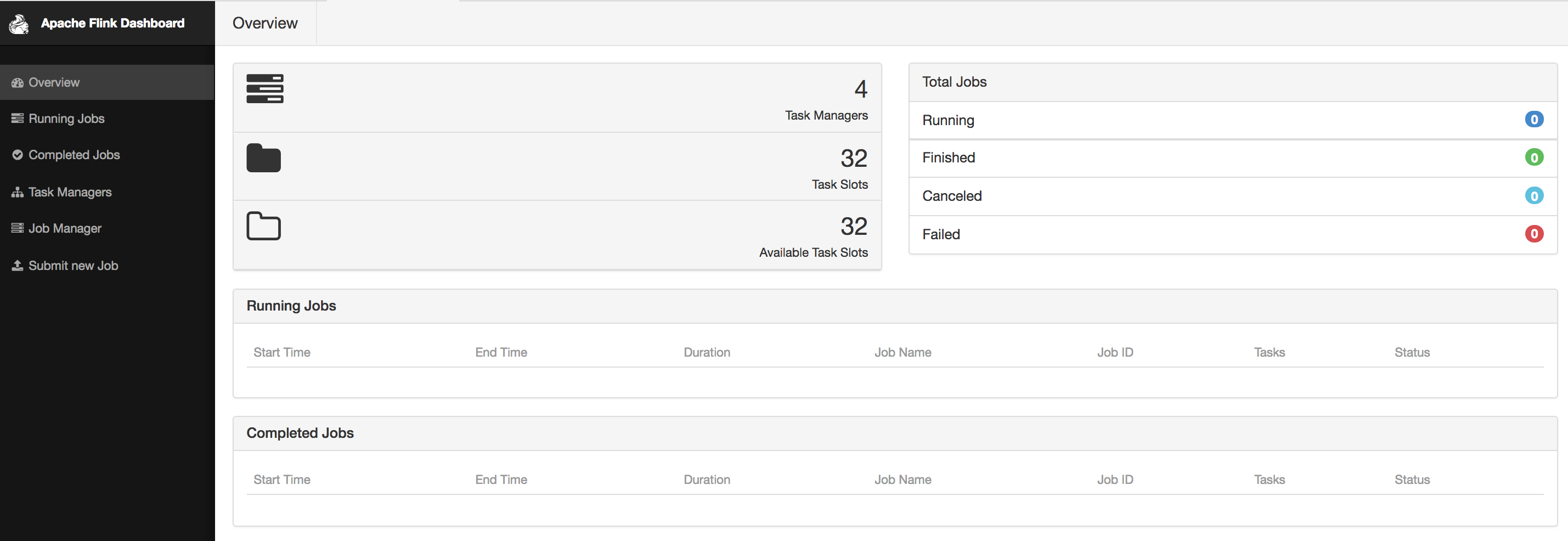 The simplest way to get an overview of your Flink cluster, as well as a glimpse of what your jobs are doing internally is to use Flink’s Web Dashboard. You can access the dashboard by visiting the URL http://<jobmanager-hostname>:8081.