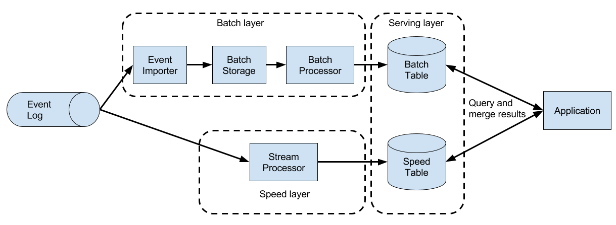 The Lambda architecture augments the traditional periodic batch processing architecture with a Speed Layer that is powered by a low-latency stream processor. Data arriving to the Lambda architecture is ingested by the stream processor as well as written to a batch storage such as HDFS. The stream processor computes possibly inaccurate results in near real-time and writes the results into a speed table. The data written to the batch storage is periodically processed by a batch processor. The exact results are written into a batch table and the corresponding inaccurate results from the speed table are dropped. Applications consume the results from the Serving Layer by merging the most recent but only approximated results from the speed table and the older but accurate result from the batch table. The Lambda architecture aimed to improve the high result latency of the original batch analytics architecture. However, the approach had a few notable drawbacks. First of all, it requires two semantically equivalent implementations of the application logic for two separate processing systems with different APIs. Second, the latest results computed by the stream processor are not accurate but only approximated. Third, the Lambda architecture is hard to setup and maintain. A textbook setup consists of a stream processor, a batch processor, a speed store, a batch store, and tools to ingest data for the batch processor and scheduling batch jobs.