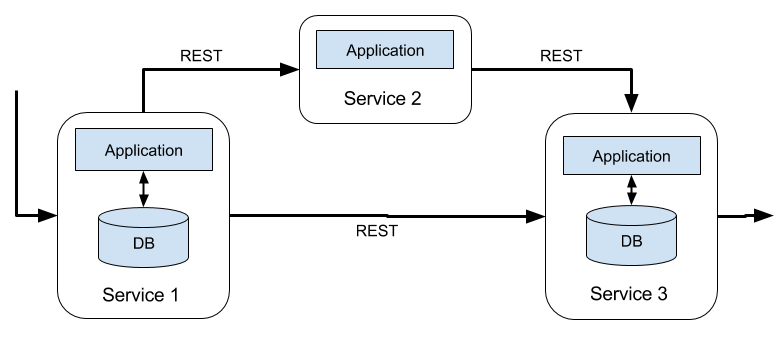This design can cause problems when applications need to evolve or scale. Since, multiple applications might work on the same data representation or share the same infrastructure, changing the schema of a table or scaling a database system requires careful planning and a lot of effort. A recent approach to overcome the tight bundling of applications is the microservice design pattern. Microservices are designed as small, self-contained, and independent applications. They follow the UNIX philosophy of doing a single thing and doing it well. More complex applications are built by connecting several microservices with each other that only communicate over standardized interfaces such as RESTful HTTP connections. Because microservices are strictly decoupled from each other and only communicate over well defined interfaces, each microservice can be implemented with a custom technology stack including programming language, libraries, and data stores. Microservices and all required software and services are typically bundled and deployed in independent containers. Figure 1-2 depicts a microservice architecture.
