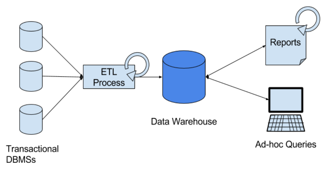 Instead of running analytical queries directly on the transactional databases, a common component in IT systems is a data warehouse. A data warehouse is a specialized database system for analytical query workloads. In order to populate a data warehouse, the data managed by the transactional database systems needs to be copied to it. The process of copying data to the data warehouse is called extract-transform-load (ETL). An ETL process extracts data from a transactional database, transforms it into a common representation which might include validation, value normalization, encoding, de-duplication, and schema transformation, and finally loads it into the analytical database. ETL processes can be quite complex and often require technically sophisticated solutions to meet performance requirements. In order to keep the data of the data warehouse up-to-date, ETL processes need to run periodically.
