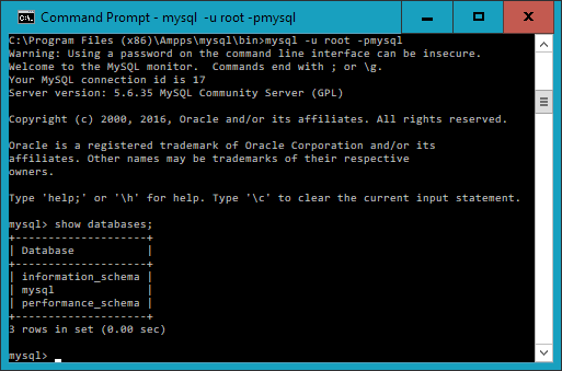 From here on out, it makes no difference whether you are using Windows, macOS, or Linux to access MySQL directly, as all the commands used (and errors you may receive) are identical.