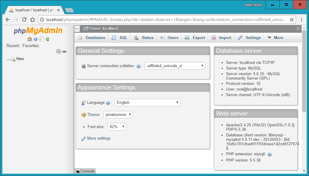 Figure 8-18. The phpMyAdmin main screen